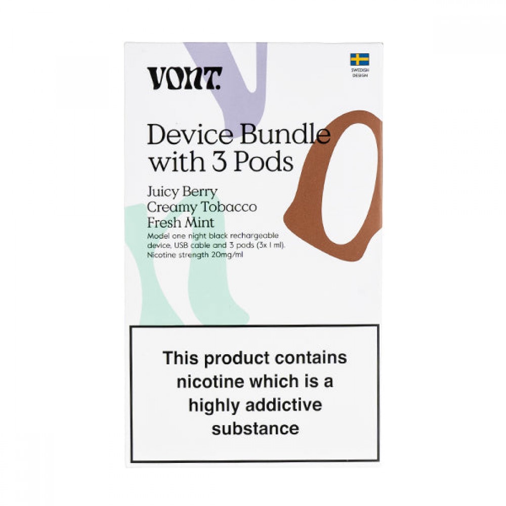 The VONT closed pod system bundle kit includes the user-friendly VONT pod device and to get you started 3 pre-filled pods, flavours included are: 1 x Juicy Berry, 1 x Creamy Tobacco and 1 x Fresh Mint.