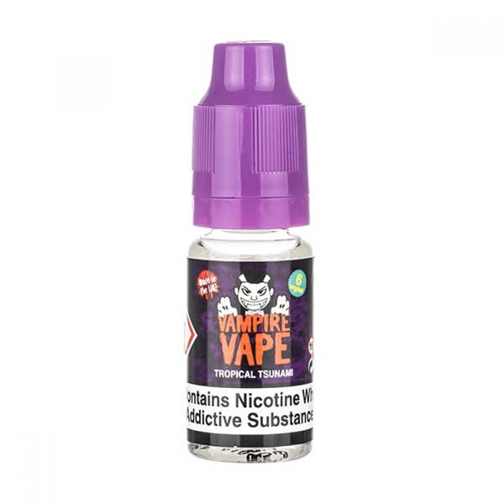 Vampire Vape Tropical Tsunami E-Liquid is a tropical fruit mix elevated by a menthol twist. Ripe pineapple and a juicy mango inhale are washed away by a cooling menthol exhale. Vampire Vape's Tropical Tsunami is served up in a 10ml bottle.